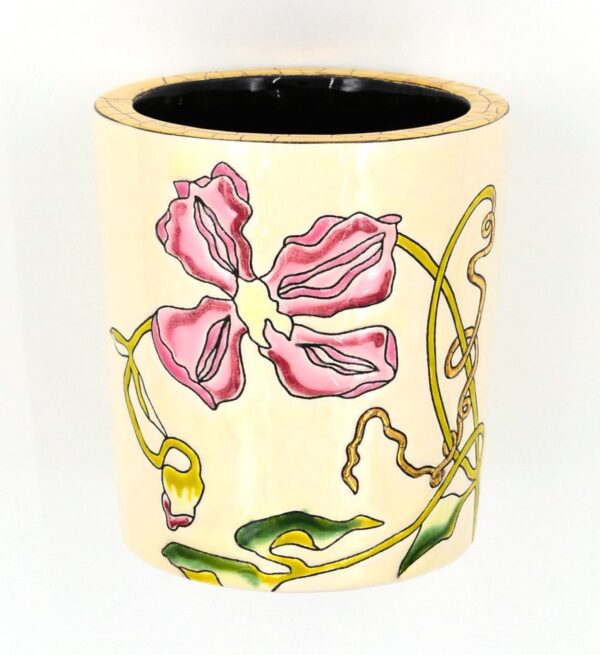 Für Jugenstilliebhaber! Elfenbeinfarbener Hintergrund, roséfarbene Blumenmotive und grünes Laub. Die Stile der Ranken und der Rand auf der Oberseite des Kerzenhalters sind mit handaufgetragenem Gold (21 Karat, 875er-Feingold) verziert. Der Kerzenhalter aus emaillierter Keramik ist komplett handgefertigt.