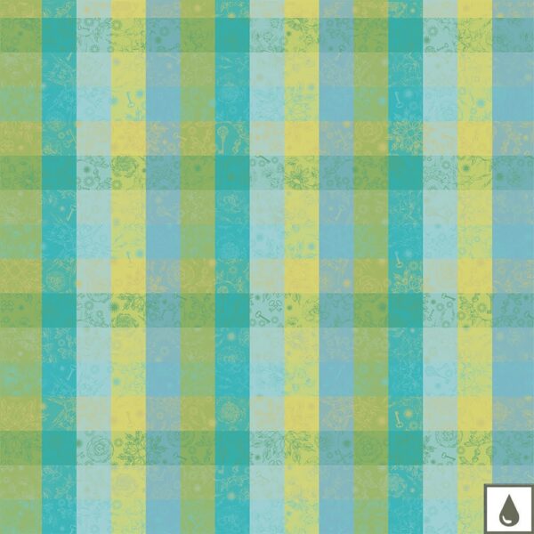 Tischtuch in verspieltem Dessin in strahlenden Türkistönen und zitronigem Gelbgrün.