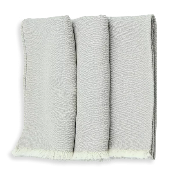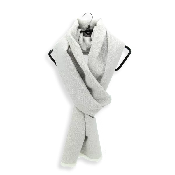 Hochwertiger Seiden Merinoschal für Damen in Perlgrau und Wollweiß. Dezenter Glanz durch edle Seide mit kostbarer Merinowolle. Für Ihren französischen Chic! Plus klimaregulierende Eigenschaft und hautschmeichlerisch-zarten Tragekomfort. Von LA FABRIQUE d’écharpe, Frankreich.