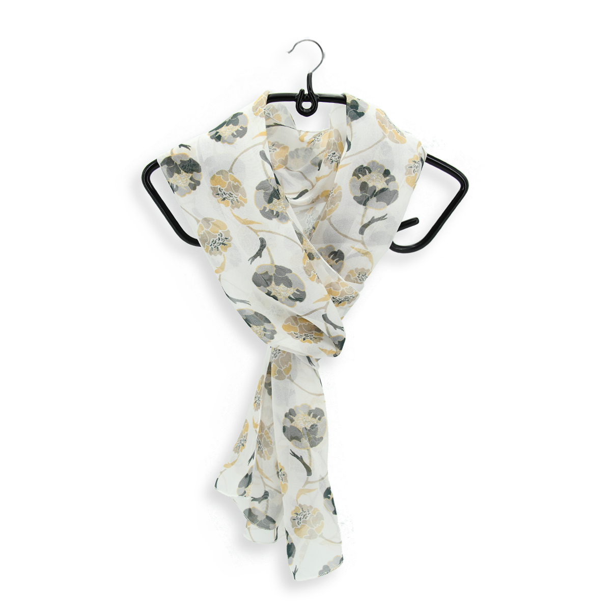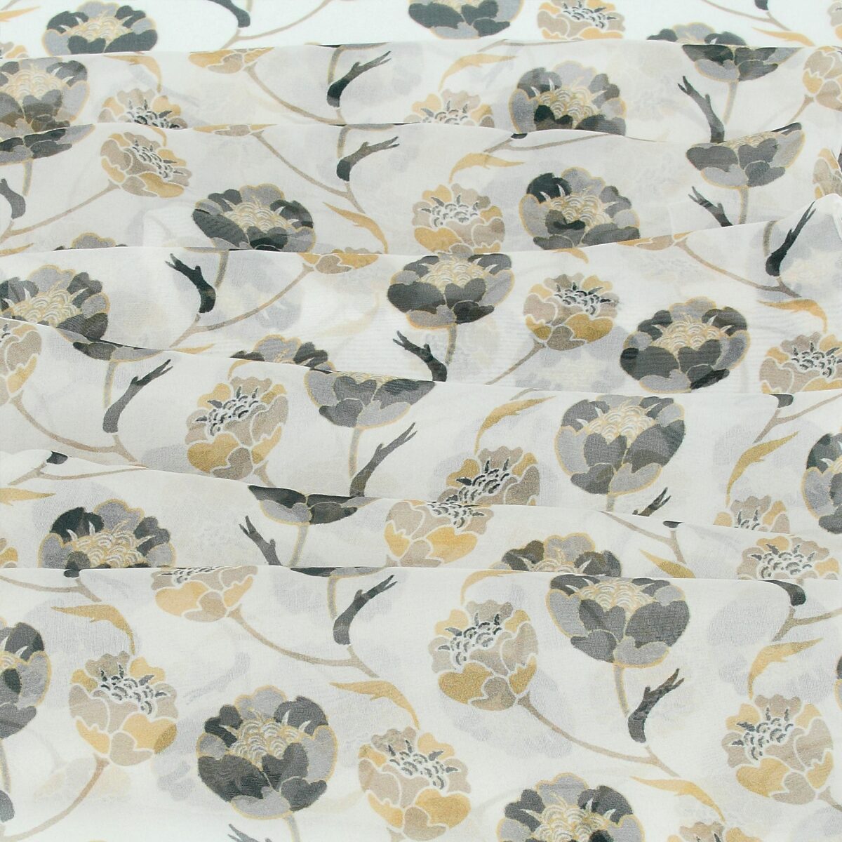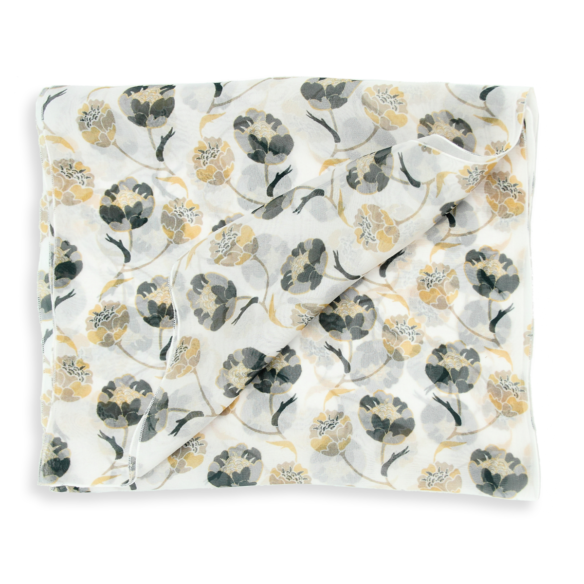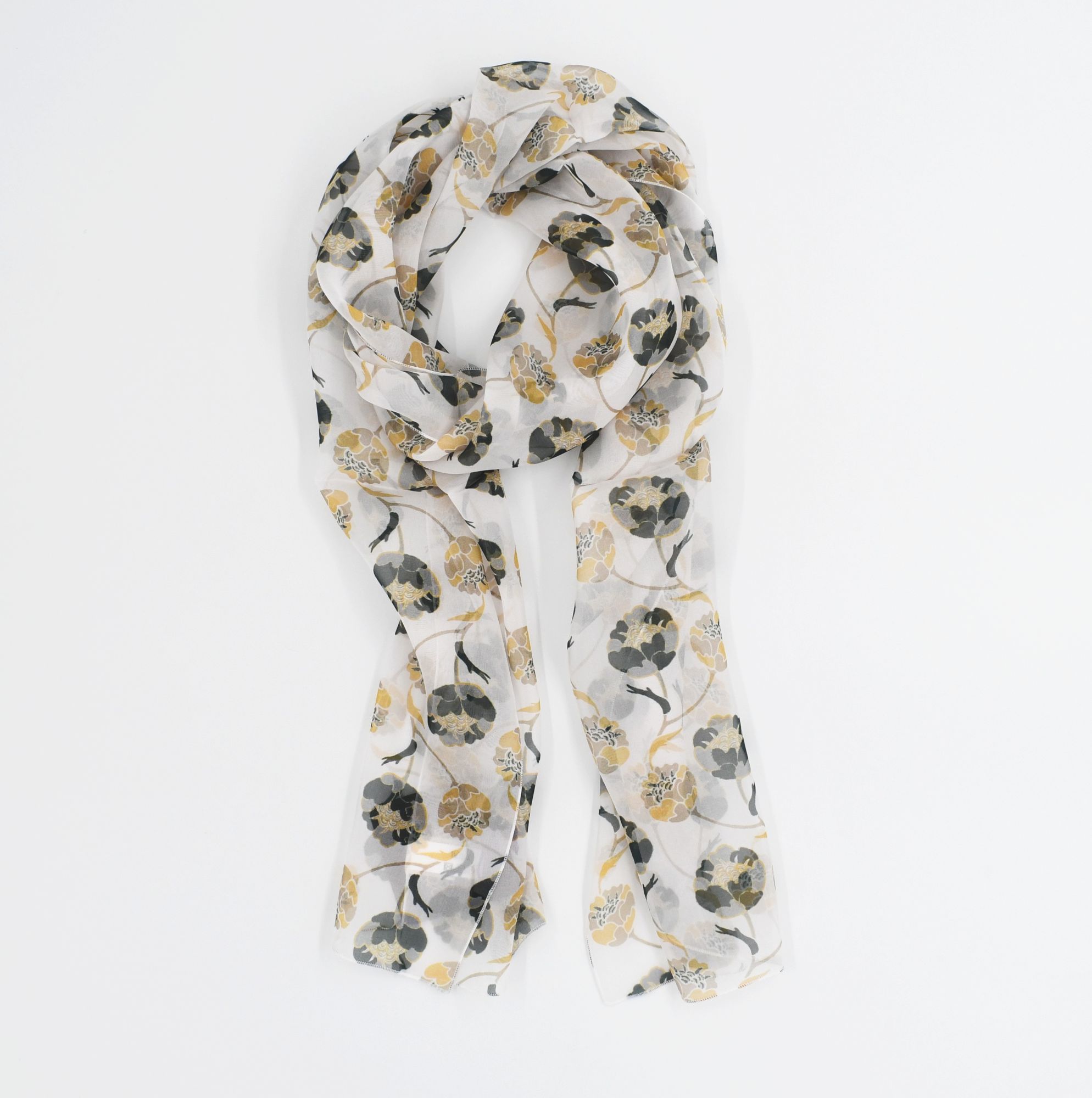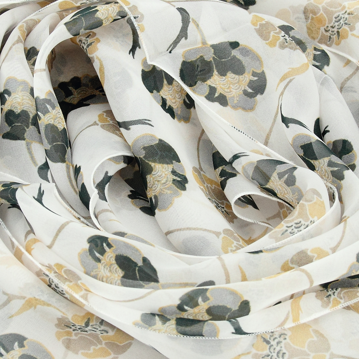 Motiv aus Knospen in Grau und Beige auf cremeweißem Grund. Luftig-leichter Seidenschal für Damen aus weichem französischem Seidenchiffon. Ein ganz besonderes Stück für Ihren französischen Chic! Von LA FABRIQUE d’écharpe, Frankreich.