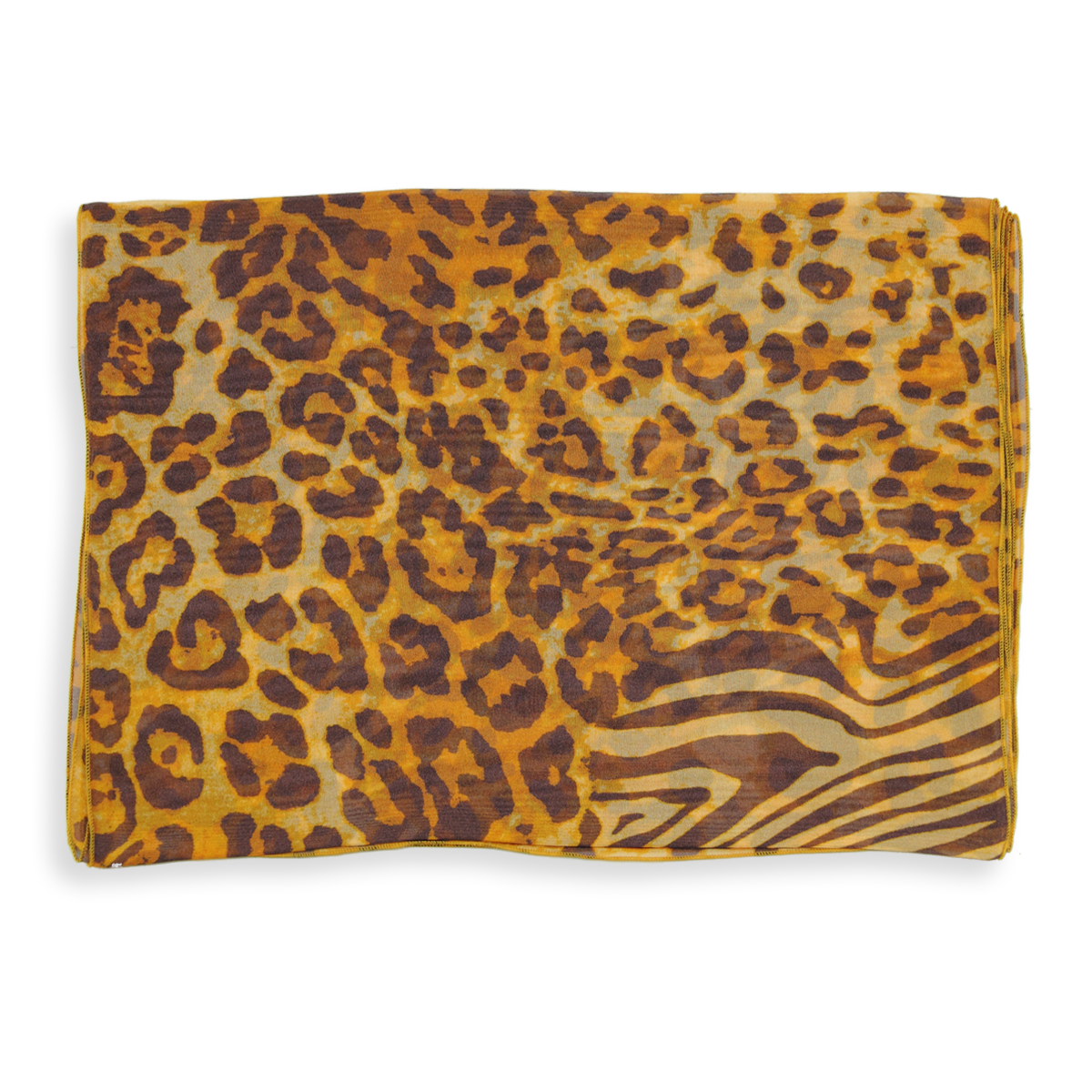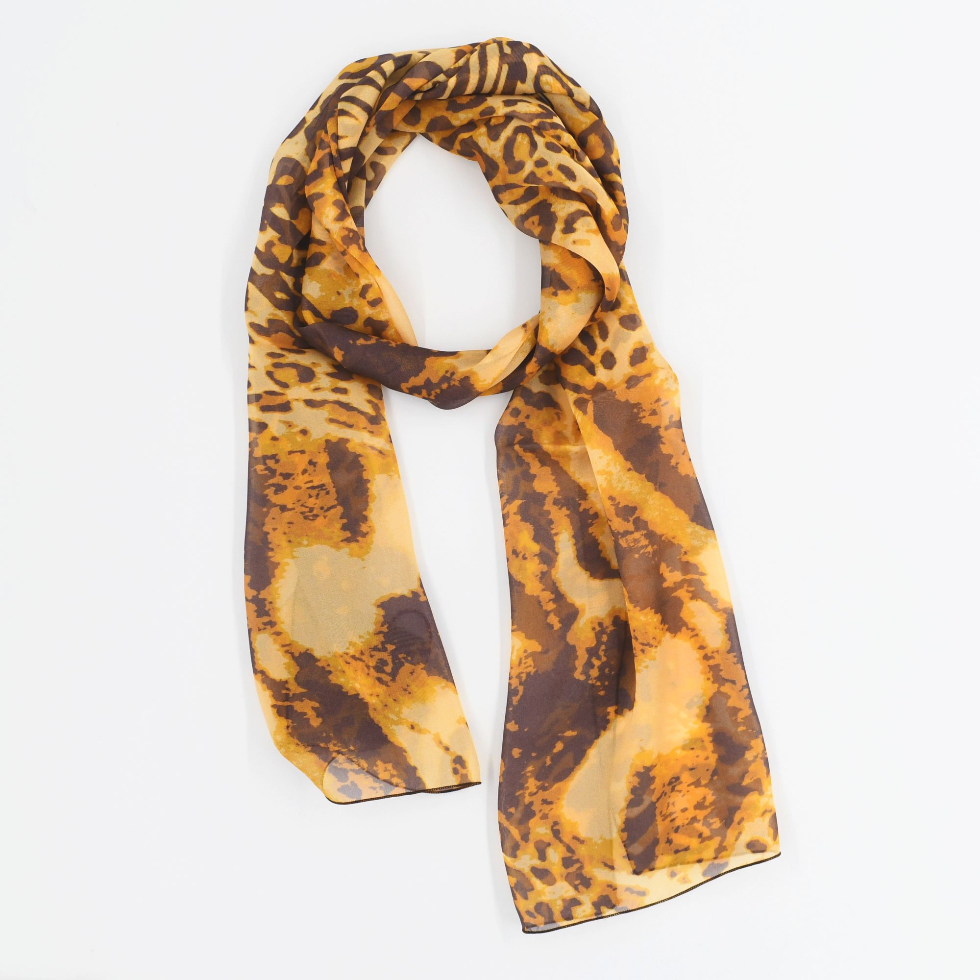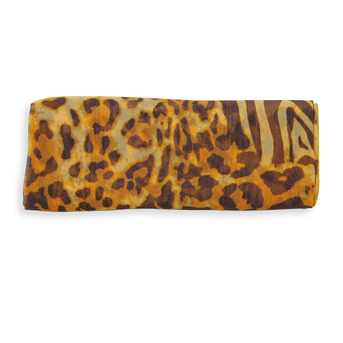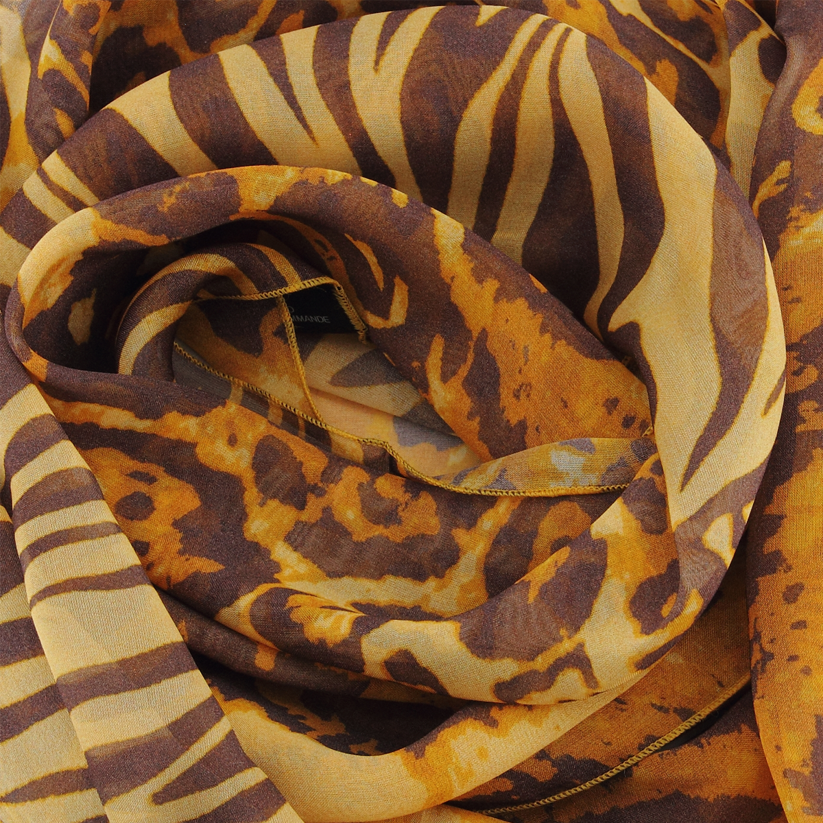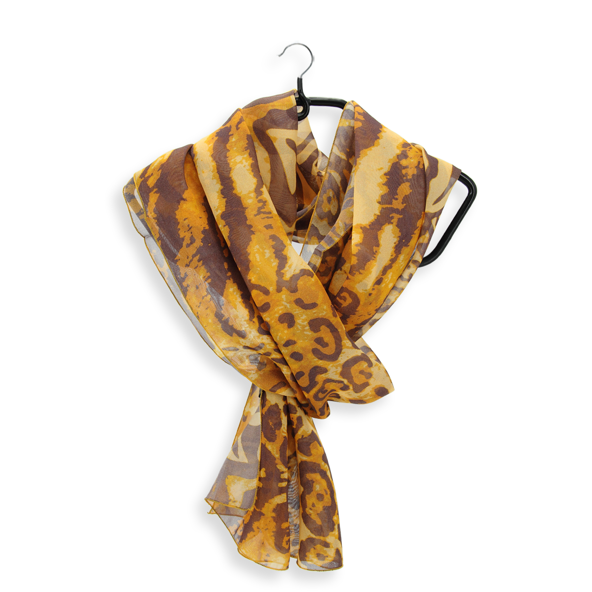 Luftiger Seidenschal für Damen in trendigem Leopardenmuster. Der hauchzarte Ruf der Wildnis aus weichem französischem Seidenchiffon. Modern designter reinseidener Schal in Orange und Braun. Von LA FABRIQUE d’écharpe, Frankreich.