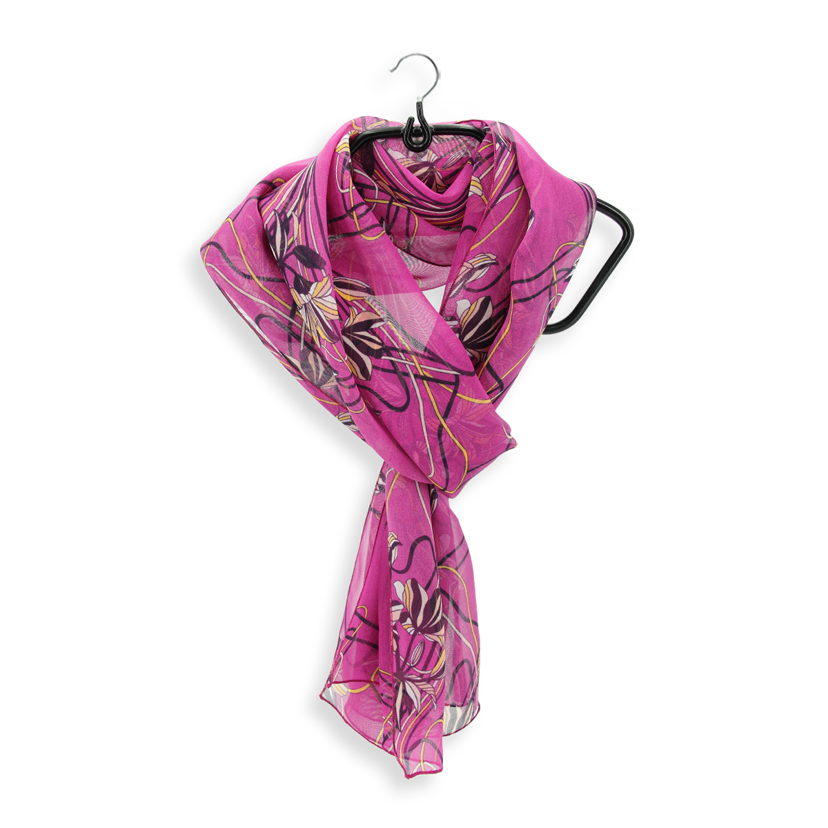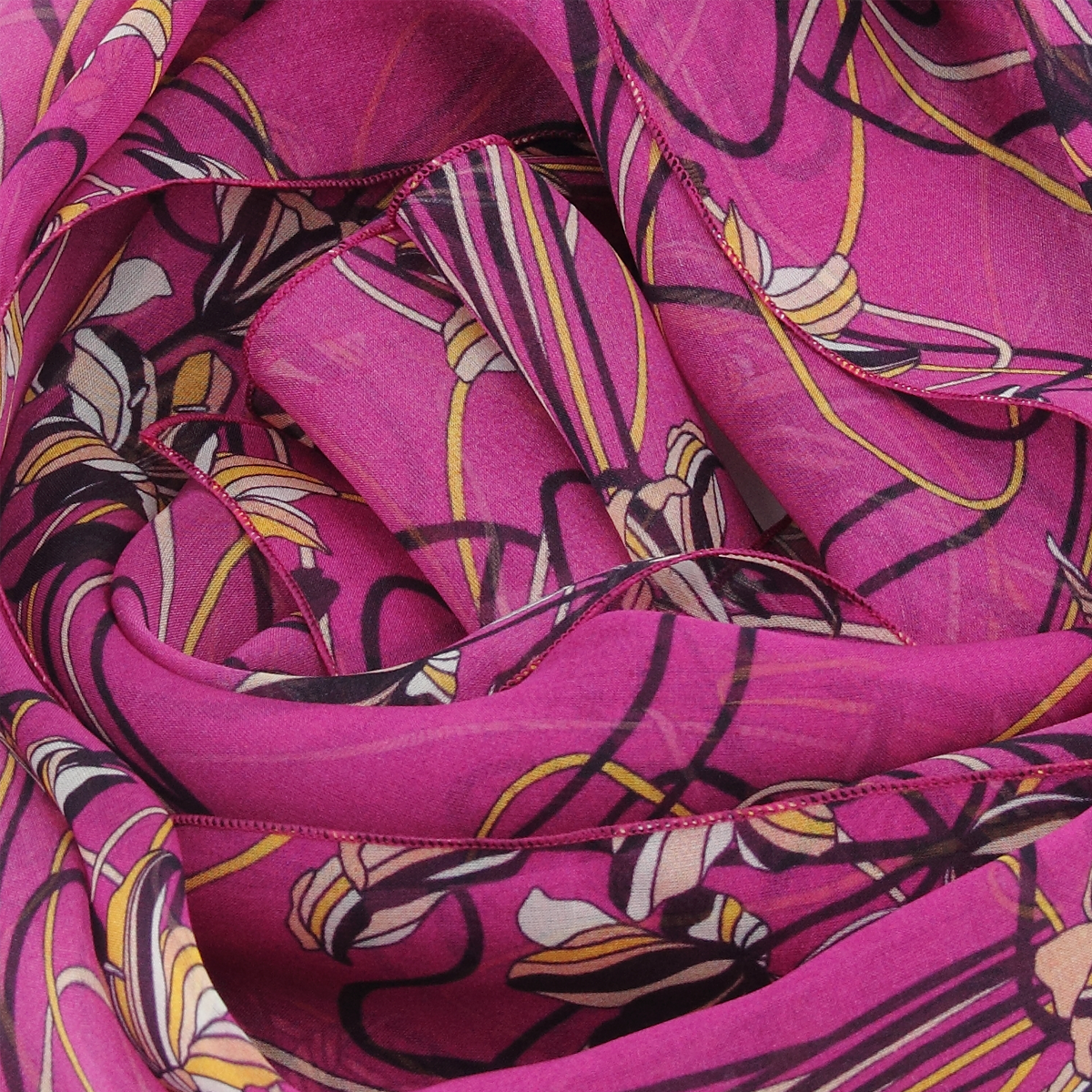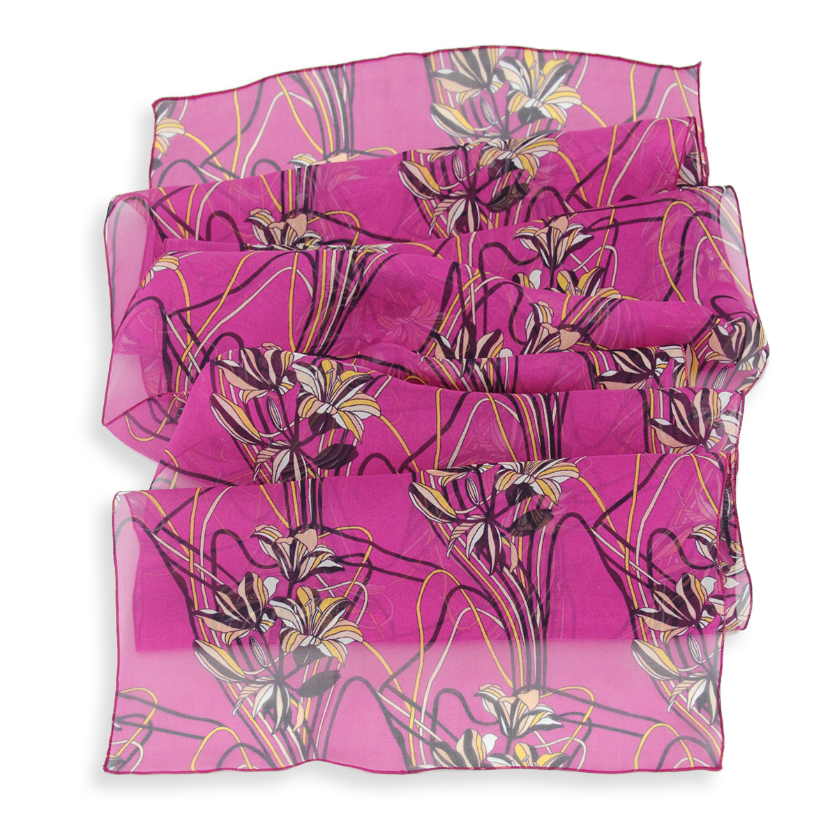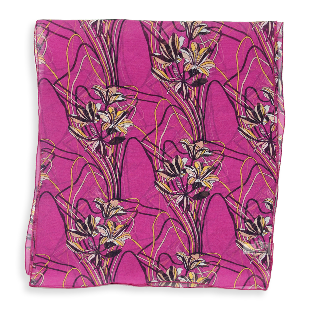 Duftig-luftiger Seidenschal für Damen mit Lilienmotiv in Magenta. Aus weichem französischem Seidenchiffon. Für Ihren französischen Chic! Von LA FABRIQUE d’écharpe, Frankreich.